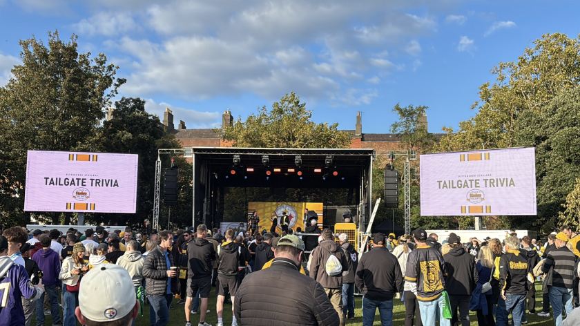 El fin de semana también ofreció la oportunidad de sumergirse en el espíritu más auténtico de la NFL: el tailgate. En Merrion Square Park se instaló el de los Steelers, y allí nos acreditaron como parte de prensa. El ambiente era una fiesta completa: música en directo, zonas de juegos para niños y adultos, entrenamientos guiados por profesionales, y entrevistas improvisadas con jugadores y aficionados. Uno de los momentos más curiosos llegó con un trivial temático en el que participaron decenas de personas; algunos lo compararon con el programa de nuestros amigos de Cañones y Football, El Tailgate, y corrió el rumor entre risas de que estaban preparando una demanda seria por plagio. Tanto, que hasta los Steelers parecían asustados.